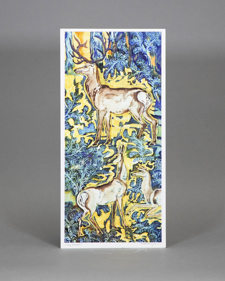 This captivating vertical composition by this artist offers a modern, whimsical interpretation of the classic woodland scene. Titled Deep Forest, this piece features a majestic stag and two does nestled within a dense thicket of stylized ferns and foliage.