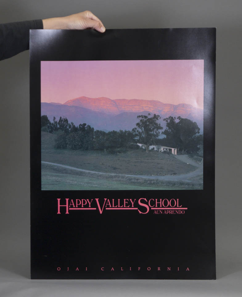 Promotional poster for Happy Valley School in Ojai, featuring a serene landscape photograph of the campus set against softly illuminated mountains at sunset. The composition highlights the rural setting and tranquil atmosphere associated with the school, with bold pink typography reading “Happy Valley School” and the Latin motto “Aún Aprendo” beneath. Printed with a black border and framed imagery, the poster emphasizes the natural beauty and peaceful environment of the Ojai Valley.