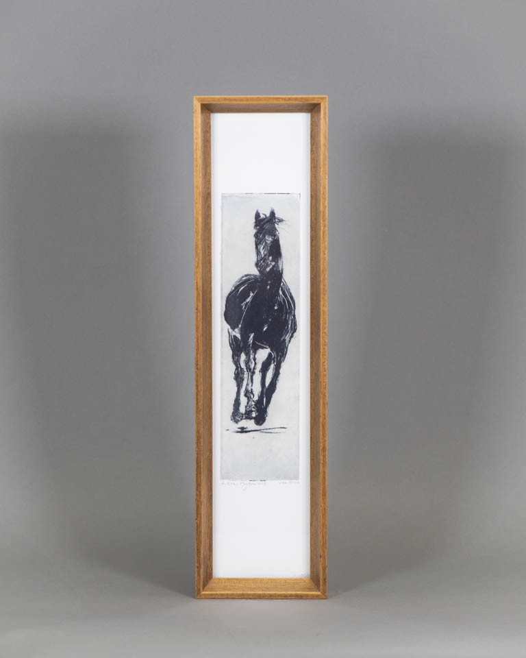 This striking equestrian study captures the raw power and kinetic energy of a horse in motion. Part of a series by contemporary artist Van Houe, this piece utilizes a vertical, narrow composition to emphasize the animal’s powerful, upward form.